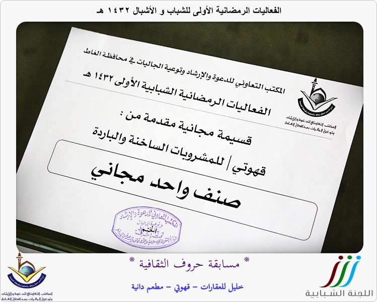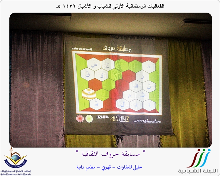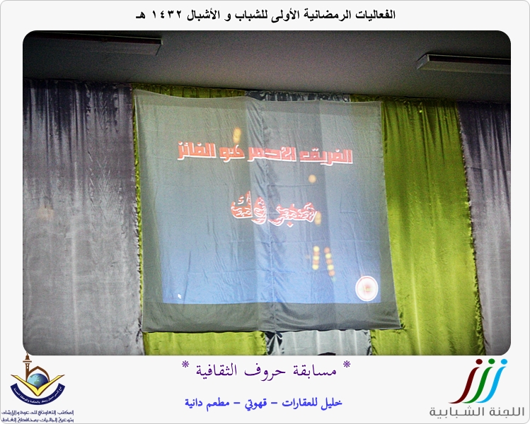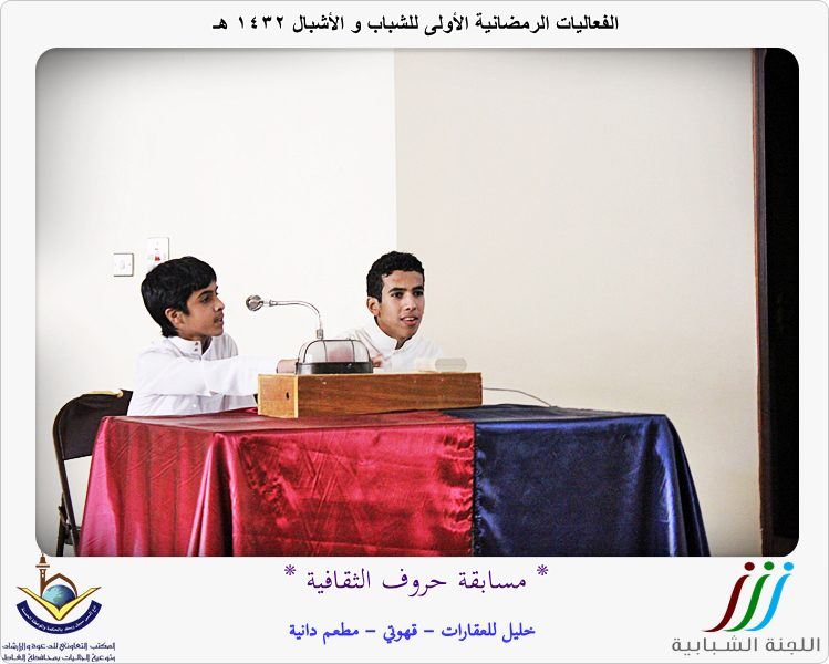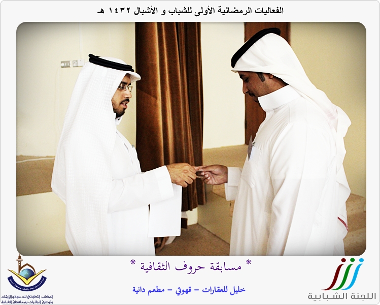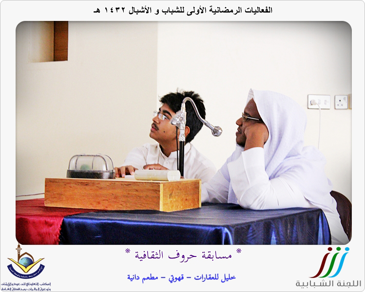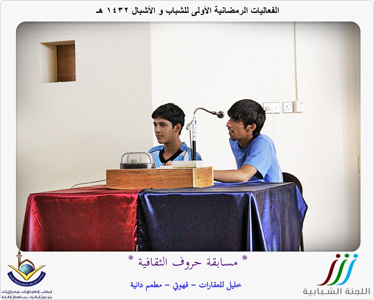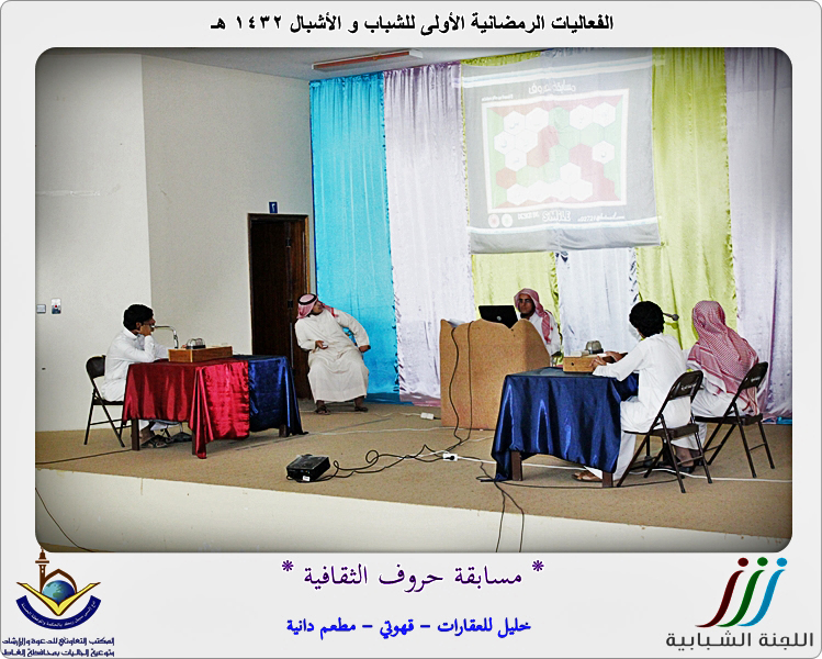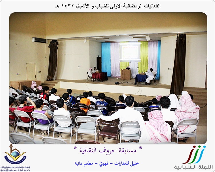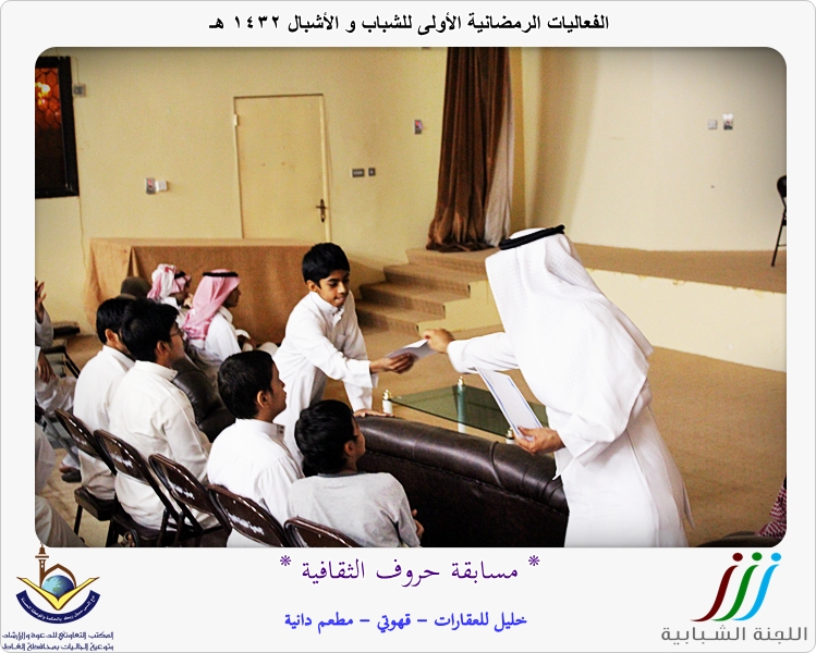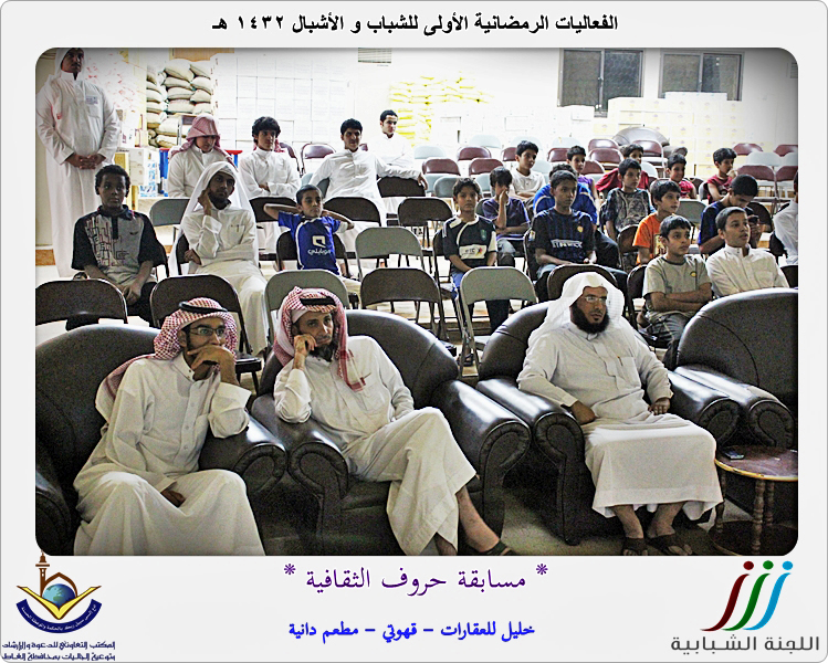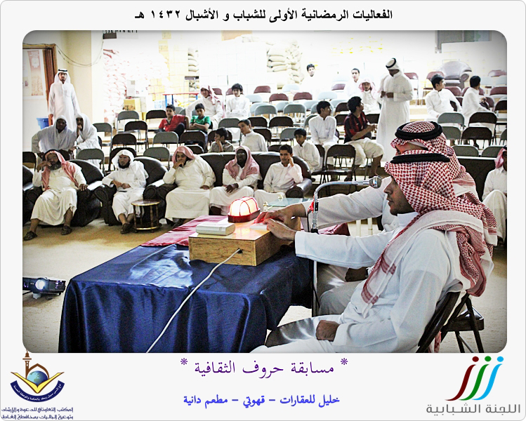 في يوم الأربعاء 3 / 9 / 1432 هـ افتتحت أول الفعاليات الرمضانية التي يقيمها اللجنة الشبابية التابعة لمكتب الدعوة والأرشاد , مبتدئة بمسابقة حروف الثقافية وكانت في منتهى الحماس و الإثارة , والان نبقيكم مع التغطية المصورة :